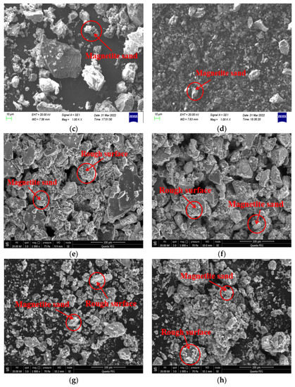 SEM diagram of magnetite sand under different modification conditions. (a) Magnetite sand without alkali activation treatment alkali; (b) Magnetite sand modified by sodium sulfate; (c) Magnetite sand modified by calcium hydroxide; (d) Magnetite sand modified by sodium hydroxide; (e) Magnetite sand modified by sodium sulfate and calcium hydroxide; (f) Magnetite sand modified by sodium sulfate and sodium hydroxide; (g) Magnetite sand modified by calcium hydroxide and sodium hydroxide; (h) Magnetite sand modified by sodium sulfate, sodium hydroxide and calcium hydroxide.
