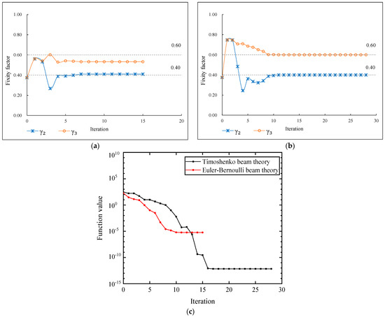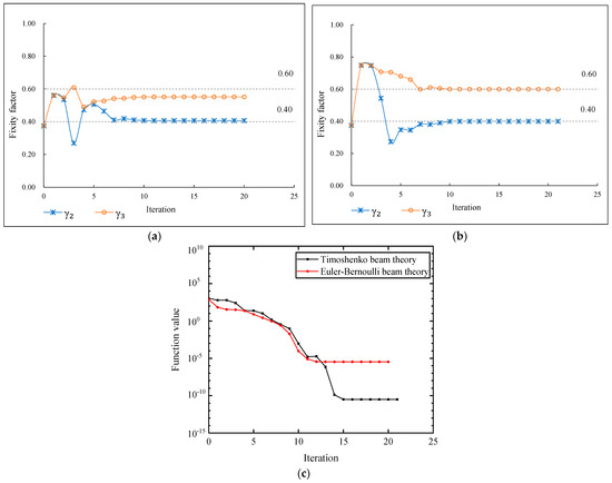 Figure 3 shows the joint identification results of the semi-rigid frame with Shape A. The iterative process for the fixity factors identification based on Euler–Bernoulli beam theory and Timoshenko beam theory are shown in Figure 3a,b, respectively. Figure 3c presents the convergence process of objective functions based on different beam theories.