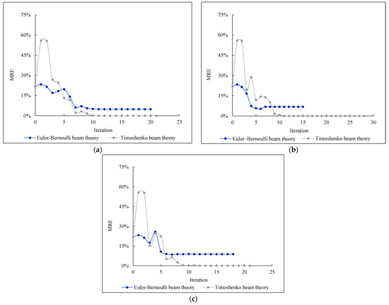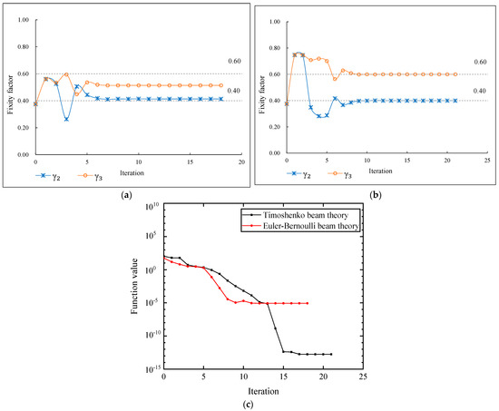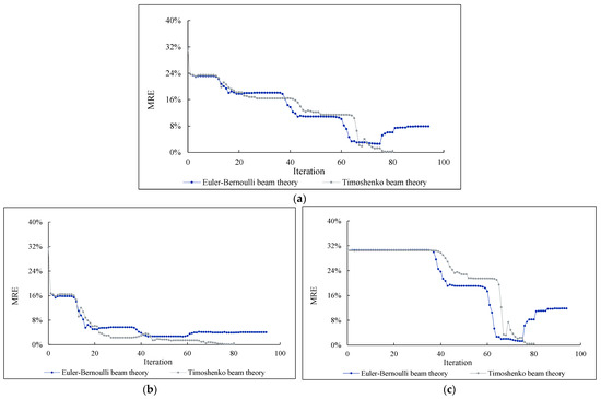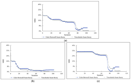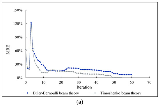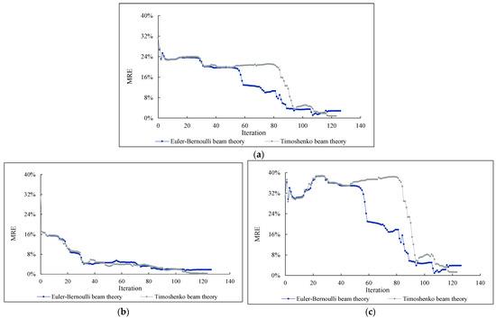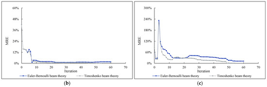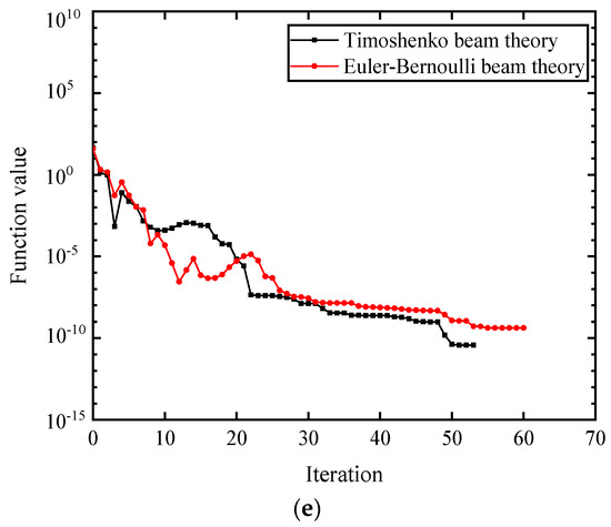 Figure 9a,b show the identification results obtained by the method based on the Euler–Bernoulli beam theory and the Timoshenko beam theory, respectively. Figure 9c displays the convergence process of different objective functions.