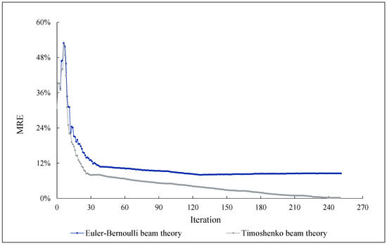 It can be observed from Figure 10 that the damage identification results based on the Timoshenko beam theory are more accurate than those based on Euler–Bernoulli beam theory, with the final MRE values are 0.20% and 8.51%, respectively. It means that the method based on the Timoshenko beam theory improves the accuracy of damage identification by 8.31%.