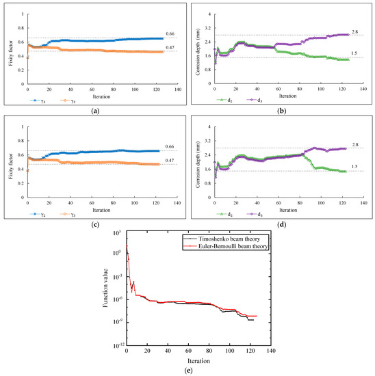 It can be found from Figure 20a–d that for the identification results based on the Euler–Bernoulli beam theory method, the accuracy of the fixity factor γ5 and the corrosion depth d8 is lower. For the method based on the Timoshenko beam theory, the identification results for both the joint damage and the member damage are accurate. Figure 20e shows the objective function established by the Timoshenko beam theory has a better convergence precision.