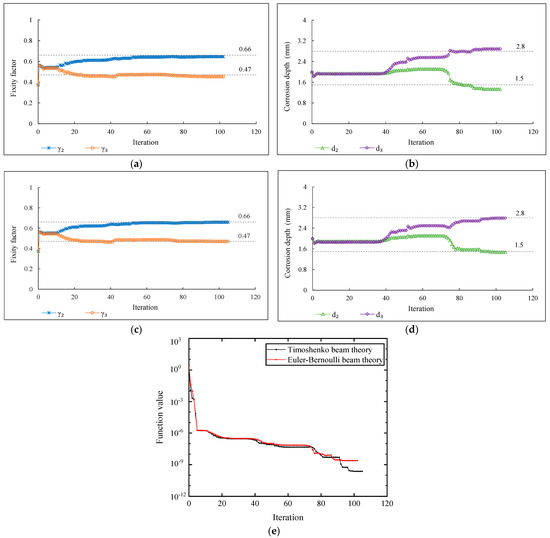 Figure 20 shows the results of damage identification based on different beam theories. Among them, Figure 20a,b show the identification results based on Euler–Bernoulli beam theory; Figure 20c,d show the identification results based on Timoshenko beam theory; Figure 20e shows the convergence process of different objective functions during the optimization.