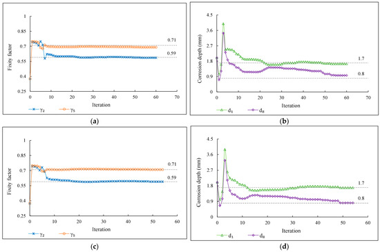 Figure 21 shows the MRE changes in the process of identifying the fixity factors and the corrosion depths.