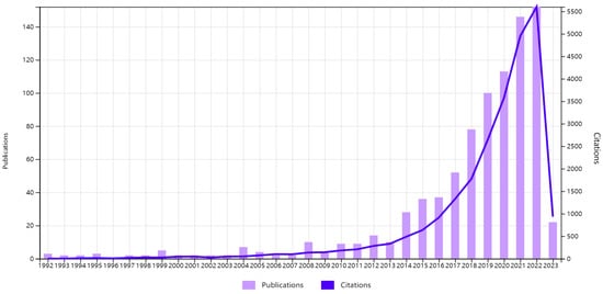 Research on aerogels in the construction field has been developing and progressing continuously and can be divided into three stages. The first stage is the budding period, during the period from 1992β2010, in which aerogel research in the field of construction had just started, the average annual number of publications is only 3.63, and the academic community lacks attention to this field. The second stage is the stable development period, during the period from 2011β2017, in which the average annual number of aerogel publications in the field of construction reached 27.42. This shows that the research in this field was gradually gaining attention and its influence on the current academic and practical communities was gradually strengthening. The third stage is the explosive period, where the average annual publication volume reaches 118.8 articles in the period from 2018β2022. With the increasing requirements of low carbon and environmental protection in the construction industry and the in-depth research on aerogel applications, aerogels in buildings have now also become a research hotspot in the field, and many scholars have started to conduct comprehensive research on the technology, process, evaluation, and influencing factors of aerogels in construction [,,,,]. By the third stage, the research of aerogels in the field of construction developed like never before and had a certain system and structure. Scholars focused on stable research directions and began to explore them in depth, leading to a certain steady growth rate of aerogel research in the field of construction in recent years. Meanwhile, according to the current research trend of aerogels in construction research, there will still be a great research space for this topic, and research will continue to grow in the next few years.