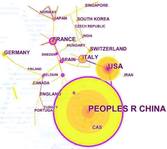 The global scientific communication and academic cooperation in various countries in this field can be explored through an econometric analysis of the posting countries. Country was selected as the analysis object in CiteSpace, the time slicing was set to β1995β2023β, the years per slice was 3, the threshold was top 50, and the final country analysis map was obtained (95 network nodes and 74 lines with a density of 0.0166).