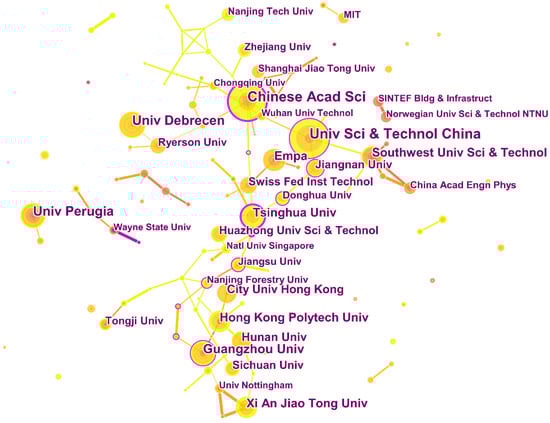 The institution was used as an object of analysis in CiteSpace, and an institution analysis profile, with 161 network nodes and 140 connected lines with a density of 0.0109, was obtained (Figure 3). The nodes are relatively dense, with a total of 140 connected lines. This shows that communication and cooperation among institutions are relatively frequent and the geographical differences in cooperation are significant. In summary, cross-institutional research on construction aerogels needs to continue to maintain transnational cooperation, and academic exchanges in the field of aerogels still need to be further strengthened. The University of Science and Technology of China, Chinese Academy of Sciences, University of Debrecen, University of Perugia, and Guangzhou University have larger nodal circles and are highly productive institutions for aerogel research in the field of construction.