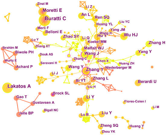The metrological analysis of authors can identify the core authors of aerogel research in the field of architecture and reflect the academic communication and cooperation among researchers in this field. Author was used as the analysis object in CiteSpace, the time slicing was set to β1995β2023β, years per slice was 3, the threshold was top = 50, and the analysis map with 326 network nodes, 559 connections, and a density of 0.0106 was constructed (Figure 4).