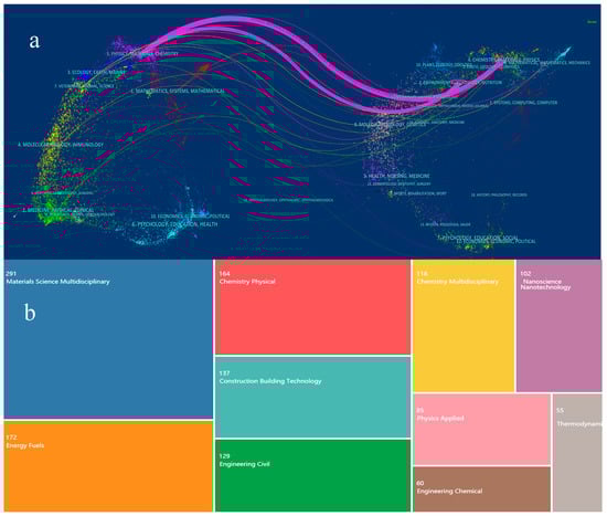 (a) Discipline double stacking, (b) discipline categories based on Web of Science top 10. Note: The left half takes the distribution of cited literature disciplines as the current research status of aerogels in construction; the right half takes the discipline to which the cited literature belongs as the research base of aerogels in construction. The wave curve connects the relationship between the research status and the research base, and the inner numbers of the oval indicate the number of publications in each discipline.