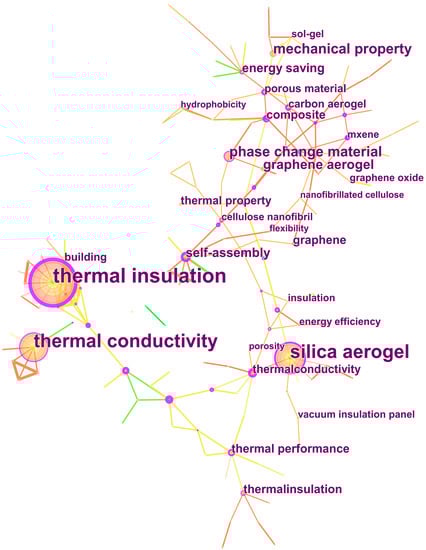 The nodes and tags for thermal insulation, silica aerogel, and thermal conductivity are large, indicating that they are current hot topics in the field of aerogels in construction (Figure 6). The key words in the outer circle, insulation and silica aerogel, are closest to purple, indicating that these research topics are the current frontiers of aerogels in the construction field. Thermal insulation was the most frequent term (84), silica aerogel ranked 2nd (62), and thermal conductivity ranked 3rd (60), all three of which are important topics of interest (Table 5). In addition, thermal insulation has the highest centrality (0.64) and is closely related to other keywords. Self-assembly has the second highest centrality (0.57) and thermal conductivity has the third highest centrality (0.54). Silica aerogel has the highest half-life (12), indicating that it still has much room for development.