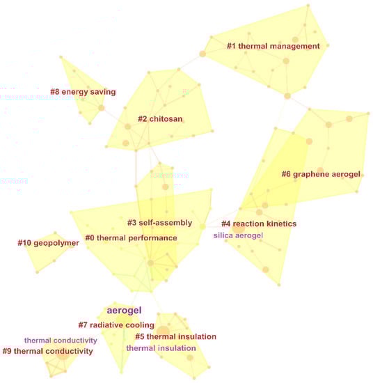 A total of 14 research themes were generated from this study as #0 thermal performance, #1 thermal management, #2 chitosan, #3 self-assembly, #4 reaction kinetics, #5 thermal insulation, #6 graphene aerogel, #7 radiative cooling, #8 energy saving, #9 thermal conductivity, and #10 geopolymer (Table 6). The mean profile values were all greater than 0.7, indicating that the effect of each cluster is consistent with the study. The average year for group 10 is 2021, indicating to some extent that cluster 10 research topics are relatively close to cutting-edge research. However, the average year for cluster 0 and cluster 7 is 2016, indicating that these two groups are more traditionally studied. In a word, the theme of aerogels is the development and application of thermal insulation properties in different fields.