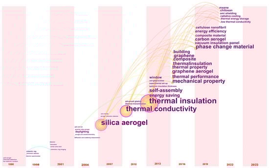 In terms of distribution, the keywords of aerogels for construction are concentrated in 1995β2023, which indicates that the research on aerogels for construction was more adequate and abundant in this time period. Specifically, in the period of 1992β2010, the research of aerogels in the field of construction was in the early stage of research and received less attention and lower frequency of key words, and research themes such as low dielectric constant, SiO2 aerogel, intermetal dielectrics, and drift chamber appeared in the field of construction research [,,], indicating that the structure and basic properties of the material are the basic research of aerogel. There are various types of aerogels, such as silica, carbon, metal, and cellulose systems. At present, the most common is SiO2 aerogel, with density of 0.003β0.15 g/cm3, more than 90% nanoscale porosity, and size less than 50 nm, which shows superior properties in thermal acoustics and optics. Thermodynamically, SiO2 aerogel at room temperature has efficient thermal insulation and very low thermal conductivity (0.02~0.03 W/(m K)); its unique pore grid structure can play an effective role in suppressing the heat conduction of solid and gas, and this porous network structure can be well maintained at high temperature of 950 Β°C. It can be seen that SiO2 aerogel is currently recognized as the optimal lightweight thermal insulation or super insulation material, which has broad research prospects and application development value in building energy saving and emission reduction.