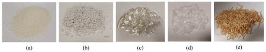 Additions used for the elaboration of plaster materials: (a) potassium polyacrylate, (b) expanded perlite, (c) glass fiber, (d) polypropylene fiber and (e) wood fiber.