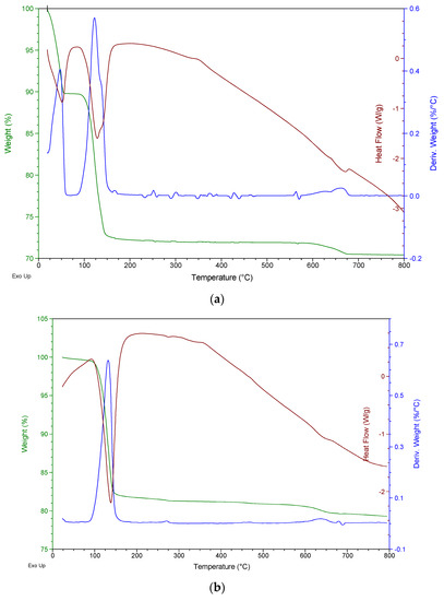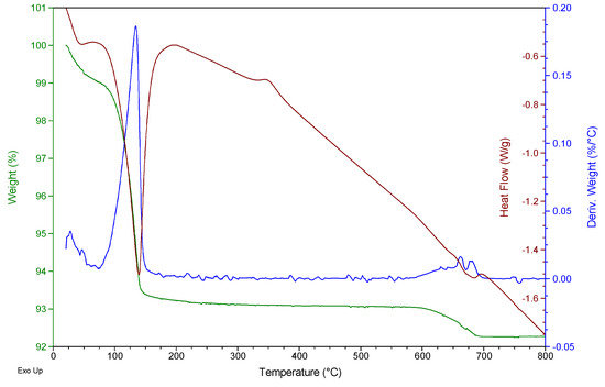 This reaction scheme becomes evident if a thermogravimetric analysis (TGA) is carried out. For this reason, Figure 2 shows the TGA (see equipment and conditions in Section 2.2) conducted for the plaster used as raw material in this research, where the mass losses associated with the different thermal events are shown. Three curves can be observed: the mass loss that occurs as the temperature increases (green), the derivative of this mass loss (blue) and the heat flow associated with this mass loss (maroon), which follow the exothermic event criterion if the peak trends upwards.