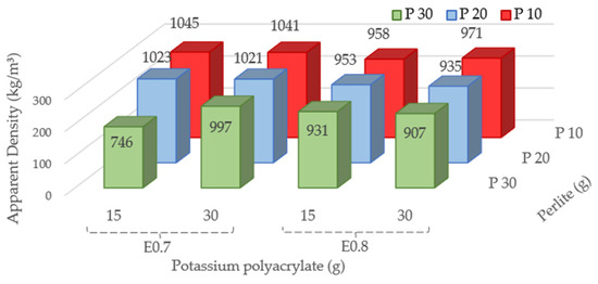 It can be seen, in the combined analysis of Table 5 and Figure 3, that, in general, the mixes with a water/plaster ratio of 0.7 by weight have higher bulk densities than their counterparts with a ratio of 0.8. However, the best results were obtained for the 0.7 water/plaster mix incorporating 15 g of potassium polyacrylate and 30 g of perlite, reducing the density by about 28.5% with respect to the reference plaster. Nevertheless, in all cases it can be observed that the combined action of the addition of potassium polyacrylate and perlite reduces the density of the plaster composites [20,23].