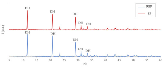 The results obtained show that both the reference sample and the lightened sample present a similar diffractogram with an identical location of the peaks, corresponding to the gypsum dihydrate (DH) and located at 2θ angle values of 11.65°, 20.74°, 23.42°, 29.15°, 31.08° and 33.37°, according to the ICDD PDF database [37].