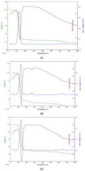 Figure 6 shows the ATG carried out for the different types of plaster analyzed in this section. The same figure shows the mass loss that occurs as the temperature increases (green curve), the derivative of this mass loss versus temperature variation (blue curve) and the heat flow associated with this mass loss (maroon curve) [52].