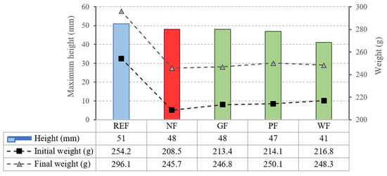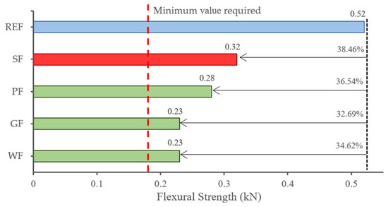 The values obtained in Figure 14 correspond only to the plaster material that would make up the precast matrix. They show that, as was the case in the test with standardized RILEM specimens of 4 × 4 × 16 cm, the incorporation of the additions to lighten the weight of the traditional plaster casts results in a decrease in their flexural strength of less than 40%, achieving, once again, values higher than the minimum of 0.18 kN required by the UNE-EN 520:2005+A1:2010 standard. This, with the addition of cardboard on both sides of the plate, would convert the precast into a material with a considerably increased flexural strength.