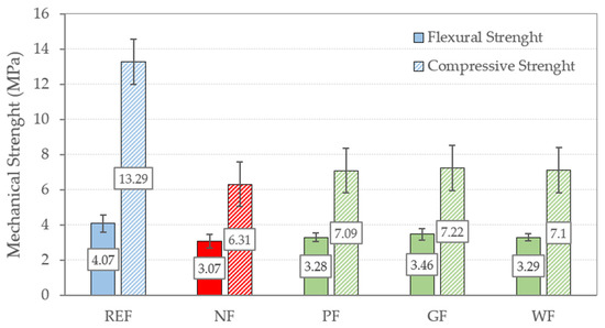 Mechanical properties of the final dosages tested in 40 × 40 × 160 mm samples. Flexural strength in solid columns and compressive strength in columns with grid pattern.