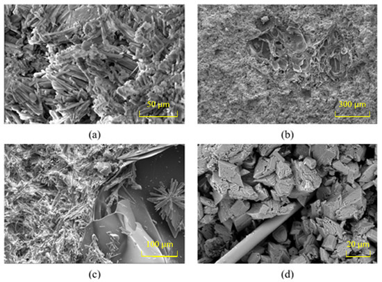 Figure 12a shows the interior microstructure of the reference plaster, in which the needle-shaped gypsum dihydrate crystals can be seen. In Figure 12b, the porosity of the new lightened plaster material as a consequence of the dehydration of the potassium polyacrylate after being placed in a stove for 24 h can be seen. Figure 12c shows the perfect bond between the dihydrate crystals and the addition of expanded perlite, and Figure 12d, highlights the interface between the reinforcement fibers and the matrix of the lightened gypsum plaster material. Although the mechanical flexural strengths increase with the incorporation of fibers in the material matrix, the adhesion between these fibers and the plaster composite is not very strong, which caused the fibers to separate via internal sliding after the test when the reinforced plasters broke [58].