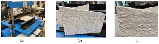 Finally, it is worth highlighting the beneficial effect derived from the inclusion of reinforcement fibers in the matrix of the composites developed for this research. In the tests related to the mechanical properties of the lightened plasters developed in the standardized tests, according to UNE-EN 13279-2, the samples made with fibers (and especially with glass fiber) improved the strength of the hardened composites. In addition, it should be noted that all the samples with fibers showed a ductile fracture and after the flexural test the tested piece did not split into two parts, as can be seen in Figure 10a. In this sense, the fibers studied appear to be suitable reinforcing materials for the use of these plaster composites in the matrix of new lightweight plates and panels.