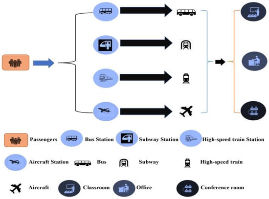 People’s work and studies are closely related to densely crowded environments, as shown in Figure 1. Means of transportation are usually boarded in transportation hubs, which contain dense and highly mobile populations. This complex environment increases the risk of personal exposure. Commuters can easily carry viruses and bacteria from transportation hubs to public transportation, where crowds are dense and the social distance is short, which increases the risk of cross-infection. Finally, controlling the level of pollutants and reducing the risk of personal exposure in the air environment of densely crowded spaces such as classrooms and offices is urgently needed.
