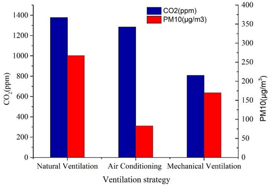 A summary of the levels of CO2 and PM10 exposure under different ventilation strategies is shown in Figure 2. The CO2 concentration is always above 1000 ppm in rooms with natural ventilation (NV) or air conditioning (AC), which indicates that ventilation is still very poor in these classrooms. Rooms with NV have the highest levels of CO2, followed by rooms with AC and MV, while rooms with MV have the lowest levels of CO2. The high concentration of CO2 in rooms with NV indicates that NV cannot fully meet the ventilation requirements for crowded spaces. The CO2 concentration in air-conditioned rooms is also high, indicating that the outdoor fresh air supply in air-conditioned rooms is insufficient. High concentrations of PM10 occur in rooms with NV, followed by rooms with MV and AC, showing that outdoor pollution is the main source of high concentrations of indoor pollutants and that AC helps control the concentration of PM10. Insufficient outdoor air filtration efficiency and building defects are also responsible for high levels of indoor PM.