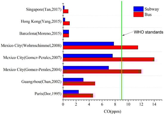 Comparison of CO concentrations in subways and buses (data from [,,,,,,,]).