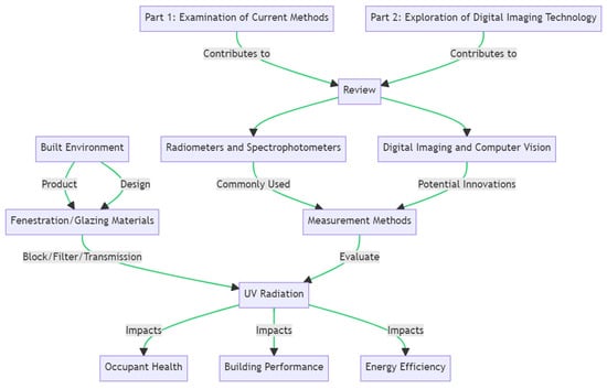 Subsequently, a discussion on the methodology employed for analysis and a review of the existing body of research will be presented in Section 3. Section 4, on the other hand, will delve into the methods currently utilized for detecting UV radiation transmission in fenestration. It elaborates on the degree of usage of UV radiation measurement techniques and outlines the UV radiation transmission properties that are characteristic of various glazing materials. The conclusions drawn from this study and relevant discussion will be presented in Section 5 and Section 6 The expectations from this research paper are manifold. The research community stands to gain a comprehensive understanding of UV radiation transmission through fenestration, alongside insightful knowledge of the current glazing materials and detection methods. The findings of this paper could also shed light on the limitations of existing materials and methods, thereby highlighting potential avenues for technological advancement. Furthermore, the significance of UV protection for health and well-being is emphasized, enriching the discourse surrounding sustainable building practices and the design of energy-efficient buildings that prioritize occupant health.