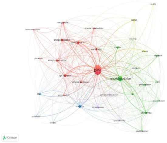 For illustrating the associations within the relevant literature, VOSviewer 1.6.19 [39] was used. This software employs co-occurrence clustering to identify high-frequency keywords, which typically represent central research issues. The network of knowledge pertaining to keywords associated with ultraviolet transmission in fenestration glazing is portrayed in Figure 4.