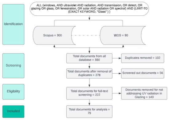 The study of ultraviolet radiation (UVR) transmission in fenestration is a complex and multifaceted field that requires a comprehensive understanding of the existing literature. To this end, an exhaustive data collection process was implemented in the current study, leveraging scientific research databases such as Google Scholar, Scopus, and Web of Science (WoS). An inclusive search formula—ALL (windows, AND ultraviolet AND radiation, AND transmission, OR detect, OR glazing OR glass, OR fenestration, OR solar AND radiation OR spectral) AND (LIMIT-TO (EXACT KEYWORD, “Glass”))—was devised to encapsulate central research concerns in this field. The expansive coverage and dependable nature of WoS and Scopus render them optimal databases for the present research [37,38]. The search parameters extended from the year 2000 to 2023, limiting the publication records to journal papers, acknowledged as credible and certified repositories of knowledge. The dataset was further fine-tuned to encompass keywords pertinent to “Glass” research areas, yielding 380 bibliographic records. These records were consequently pruned down manually to 79 key pieces of literature. Furthermore, as shown in Table 2, the criteria were developed to effectively decrease the number and difficulty of reviews and to help screen articles.