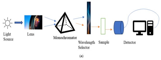Typical layout of a spectrophotometer: (a) single-beam spectrophotometer; (b) double-beam spectrophotometer. Adapted from [43,44,45].