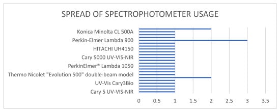 Several types of spectrophotometer devices are utilized in fenestration UV measurements, including the UV-vis spectrophotometer and Perkin Elmer Lambda Spectrophotometer. Figure 8 displays the distribution of spectrophotometer manufacturer varieties used to detect UV transmission in fenestration. The UV-vis spectrophotometer, a prevalent spectrophotometer type, uses light in the ultraviolet and visible regions of the electromagnetic spectrum. This device quantifies the absorption, reflectance, and transmission of a single-light wavelength as it traverses a sample. The light intensity after the sample passage is compared to the initial light intensity, referred to as the reference or background intensity [47].