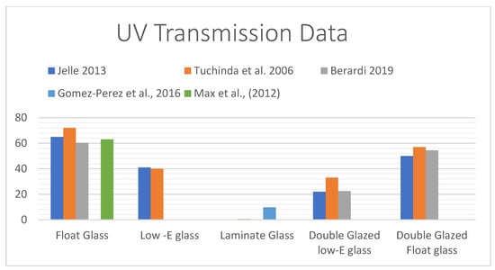 Identifying appropriate glazing materials is pivotal to achieving maximum energy efficiency in buildings, simultaneously ensuring the health and comfort of occupants. Information concerning mechanical resistance, acoustic insulation, and thermal transmittance are usually provided by glass manufacturers for their products. However, such information tends to lack specificity and omit specific data pertaining to the material’s behavior within the ultraviolet radiation spectrum [40]. Ultraviolet transmission serves as an indicator of the degree of protection or potential harm that a substance or material can offer or inflict when subjected to UV radiation. There exists a plethora of instruments for measuring UV transmission, each demonstrating varying degrees of accuracy and ease of use.