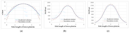 Figure 3 shows the comparison of the analytical solution and the simulation results, in which the model is created by ABAQUS software. For the deflection at the center of the lower plate, the result of the finite element model is smaller than that of the analytical solution when it is close to the edge of the plate, while when it is close to the center of the plate, the situation is just the opposite (Figure 3a). For the bending moment of the lower plate at x = 0.5 m and y = 0.5 m, the curve increases slowly at the edge of the plate, and as it approaches the center of the plate, the curve increases first and then decreases (Figure 3b,c). It can be concluded that the results of finite element model well support the present results using the thin plate theory.