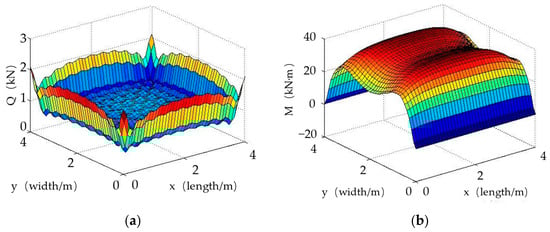 Therefore, the undetermined coefficients , , , , , , , , , , , and could be obtained by twelve equations (Equations (7)–(18)), in which N1, N2, M1, and M2 are the maximum values of n1, n2, m1, and m2, respectively. Thus, the number of the governing equation is 2(M1 + 1)(N1 + 1) + 2(M1 + 1) + 2(N1 + 1) + 2(M2 + 1)(N2 + 1) + 2(M2 + 1) + 2(N2 + 1), which can be used to solve the same number of undetermined coefficients. In order to ensure the correctness of the calculation results, the maximum values of M1, M2, N1, and N2 are taken to 20. Substituting the solved coefficients into Equation (1a,b), the deflection of the plate can be obtained, and further, the internal force and the foundation reaction can also be calculated.
