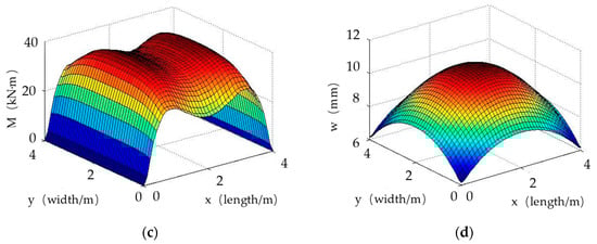 Calculation results using thin plate theory: (a) Subgrade reaction; (b) Bending moment of the plate (My); (c) Bending moment of the plate (Mx); (d) Deflection of the plate.