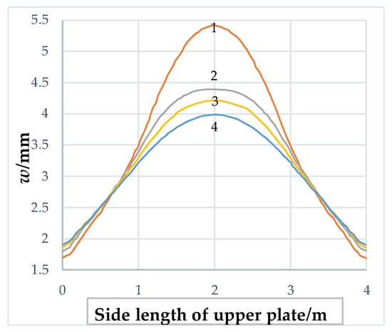 It can be seen from Figure 6 that the deflection of the center of the plate increases as the size of the upper plate increases. It can also be found that when the coordinates of x are between 0–1 or 3–4, the deflection growth rate is relatively fast, while the growth rate of deflection is slow when 2 < x < 4, indicating that the existence of the upper plate increases the stiffness of the lower plate.