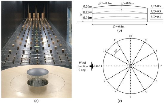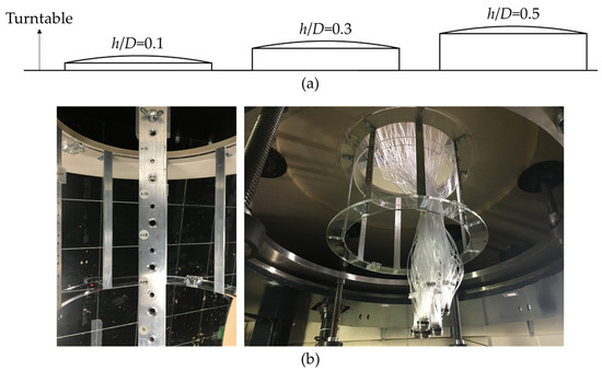 The wind tunnel experiments were conducted at a large boundary layer wind tunnel laboratory located at Tokyo Polytechnic University. The model used in the experiments and pressure taps installed on the roof are shown in Figure 1. The model has a length scale of 1/150, resulting in a rise (f) of 0.04 m and a span (D) of 0.4 m for the roof. The height of the model was adjusted in increments of 0.08 m using a turntable, and the experiments were conducted at heights of 0.04, 0.12, and 0.20 m. Table 1 lists the detailed dimensions of the model. Figure 1b shows the dimensions of the model: f/D and h/D. Figure 1c shows the pressure taps and wind directions used in these experiments. In the experiment, 205 pressure taps were placed on the roof of the model along 12 lines. Each line was arranged at 30° intervals, with 18 pressure taps installed per line, including a pressure tap at the center of the dome. Because the spherical dome roofs exhibited symmetrical values along the centerline, the wind direction was not adjusted. Figure 2a shows the cross-sections of the model with varying h/D values. Figure 2b shows the height adjustment tool of the experimental model installed under the turntable. While adjusting the height of the model using the tool shown in Figure 2b, the wind pressure data for h/D = 0.1, 0.3, and 0.5 were obtained.