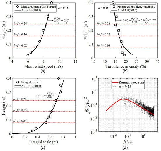 The measurement section of the boundary layer wind tunnel had dimensions of 2.2 m (width) × 1.8 m (height), with a length of 19 m. Assuming a nonurban area, the power-law exponent (α) of the mean wind speed profile was set to 0.15, referring to the Japanese wind load code (AIJ-RLB) [18]. Turbulent boundary layer flow was simulated using spires, barriers, and blocks of various sizes (Figure 1a). The mean wind speed and turbulence intensity profiles are shown in Figure 3a,b, respectively. In this study, the characteristics of the approaching flow were reproduced based on dome-roof heights. At each roof height (h + f = 0.08, 0.16, and 0.24 m), the mean wind speed and turbulence intensity were consistent with the code values, with an error rate of less than 3%. Based on an assumed velocity scale of 1/3, the mean wind speed at the highest point of the roof for a model with h/D = 0.5 (h + f = 0.24 m) was determined to be 8.28 m/s, with a turbulence intensity of 15%. Figure 3c,d show the turbulence integral scale and longitudinal power spectra of the fluctuating wind speed, respectively. Both the turbulence integral scale and power spectra of the fluctuating wind speed showed good agreement with the AIJ-RLB(2015) [21] code and the Karman spectrum.