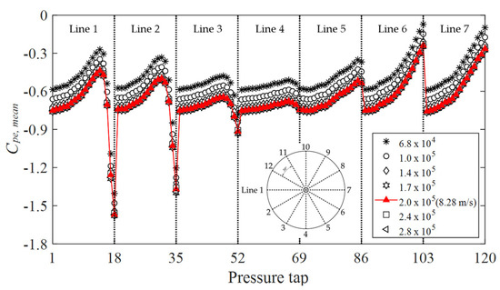 The Reynolds number was defined using the span D and the mean wind speed at the maximum height of the roof. In this study, the Reynolds number varied from 1.8 × 105 to 2.6 × 105. According to previous studies pertaining to dome roofs, when the Reynolds number exceeded 1.0 × 105, the location of the flow separation remained unchanged, and the wind pressure was stable [5]. Figure 4 shows the mean pressure coefficients along several pressure taps lines on the surface of the dome roof for different Reynolds numbers. Because the values are symmetrical with respect to the centerline (lines 1 and 7), the pressure tap values from lines 1 to 7 are expressed. Pressure tap #1 on the x-axis of Figure 4 is the wind pressure tap located at the center of the dome, and taps #18, #35, #52, #69, #86, #103, and #120 are the wind pressure taps located at the edge of the dome roof. The mean pressure coefficient stabilizes when the Reynolds number is greater than 2.0 × 105. Based on the initial experiment, the wind speed at which the wind pressure coefficient was stable was determined and subsequent experiments were conducted. The maximum blockage rate was 2.0%; therefore, data correction was unnecessary.