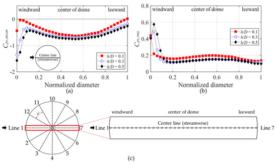 Figure 5 shows the mean pressure coefficient (Cpe,mean) and the fluctuating pressure coefficient (Cpe,rms) of the streamwise centerline. The x-axis represents the normalized diameter based on the pressure tap distance and diameter of the model, whereas the y-axis represents the wind pressure coefficient. The locations of the pressure taps installed on the centerline are shown in Figure 5c. As shown in Figure 4, the normalized diameters 0 and 1 are the absolute values at wind pressure tap numbers #18 and #120, located on the roof edges of lines 1 and 7, respectively. In Figure 5a, Cpe,mean exhibits a rapid change in absolute value in the normalized diameter range of the windward zone of 0–0.15. This phenomenon is attributed to the separation of the approaching flow at the windward roof edge and reattachment at around the normalized diameter of 0.15; this is consistent with the results of previous studies on dome roofs with similar f/D ratios [15,16,17,18,19,20]. After reattachment, the absolute value gradually increased, and as the flow moved toward the leeward side, the absolute value gradually decreased. This is related to the influence of the boundary layer formed on the dome surface, pressure recovery in the leeward zone, and wake. As h/D increases, the absolute value increases in all areas, and the reattachment distance tends to increase with h/D in the windward area. This is because as h/D increases, the wind speed increases and the turbulence intensity decreases [13,15,16,17,18,19,20]. Figure 5b shows the Cpe,rms. As shown in the mean pressure coefficient in Figure 5a, a rapid change in the absolute value of the normalized diameter corresponding to the windward zone was observed in the range of 0–0.15. As previously described, this is because of the separation of the approaching flow from the windward roof edge and reattachment near a normalized diameter of 0.15. At the area after reattachment, the mean pressure coefficients changed gradually, and the variable fluctuating pressure coefficients also changed gradually below 0.2. This was also due to the boundary layer of the dome surface and influence of the wake, as previously described.