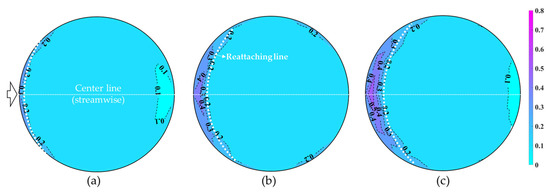 Figure 6 shows the contours of Cpe,mean for different h/D values to present the overall mean pressure distribution acting on the roof surface. As mentioned above, as h/D increased, the overall absolute value increased, and the reattachment position (white dotted line) moved further from the windward roof edge. Moreover, significant changes in wind pressure were observed owing to the separation, reattachment, pressure recovery, and wake effects as the flow moved toward the leeward side along the streamwise centerline. However, similar wind pressures are observed in the spanwise direction.