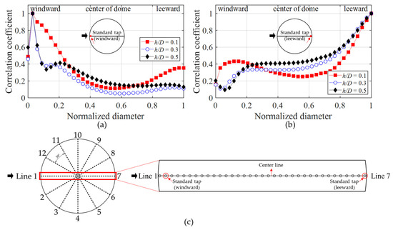 where is the covariance of the wind pressure coefficient at each pressure tap; and are the standard deviations of wind pressure coefficient, respectively. The x-axis represents the normalized diameter, which is the same as that in Figure 5. The locations of the standard pressure taps selected to calculate the correlation coefficients are shown in Figure 8c. Figure 8a shows the values calculated based on the second pressure tap in the windward area, which were influenced by the vortices caused by the windward separation. A relatively weak correlation was observed at the pressure tap located at a normalized diameter of zero on the windward edge of the roof. This phenomenon occurs because the windward edge of the roof is subjected to a separation influence and the slightly direct influence of the approaching flow [11]. This phenomenon was observed only at the first pressure tap located at the roof edge of Line 1. As the pressure tap moved toward the leeward side, the correlation rapidly decreased, reaching its lowest point at a normalized diameter of approximately 0.15, where reattachment occurred. Meanwhile, the correlation for h/D = 0.1 decreases more gradually, due to reattachment near the reference pressure tap caused by a lower h/D. Figure 8b shows the values calculated based on the pressure tap at the leeward edge of the roof. Between the normalized diameters of 0.8 and 1.0, the correlation coefficient was greater than 0.6, showing a relatively rapid increase compared to other areas, owing to the wake occurring in the leeward zone. Jang and Lee [22] investigated the flow around spherical dome roofs using particle image velocimetry (PIV) techniques and demonstrated the existence of small-scale vortices caused by wakes in the leeward area of the dome roof.