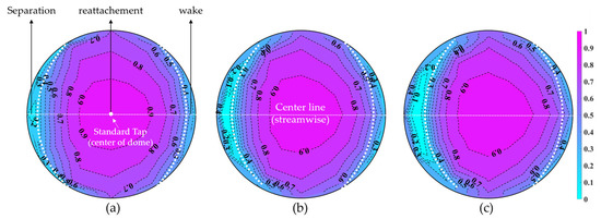 Figure 9 shows the correlation coefficients for the entire pressure tap of the dome roof, calculated based on the pressure tap at the dome center and represented as a contour. The zone corresponding to the dome center, indicated by the white dotted line on the contour, exhibited large correlation coefficients above 0.6. In contrast, as previously explained, the windward zone influenced by the separation and the leeward zone influenced by the wake showed correlation coefficients lower than 0.4.