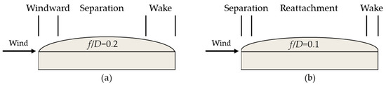 Based on the aforementioned pressure and correlation coefficients, the flow patterns in the different zones of a dome roof with f/D = 0.1 can be inferred. Figure 10 shows the zones divided according to the flow patterns on the dome roof. Figure 10a shows a conceptual diagram of the zones divided by Lo and Kanda [13] after analyzing the fluctuating pressure on a dome roof with f/D = 0.2. When f/D was greater than 0.1, the windward zone was directly affected by the approaching flow, with positive pressure acting predominantly. As the flow moved from the dome center to the leeward side, separation occurred, and the influence of the wake was divided into three zones: windward, separation, and wake. However, at relatively low f/D = 0.1, which is the subject of this study, the zones can be divided based on the analyzed pressure and correlation coefficients, as shown in Figure 10b. Based on Figure 6, Figure 7, Figure 8 and Figure 9, areas with a normalized diameter of 0.15 to 0.8 that show a relatively small correlation coefficient with gradual changes in pressure coefficient are classified as reattachment areas, while areas with a normalized diameter of 0 to 0.15 are classified as separation areas, and areas with a normalized diameter of 0.8 to 1.0 are classified as wake areas. To compare these areas under the same conditions, they were classified based on the pressure and correlation coefficient values of h/D = 0.5. Compared with previous studies conducted using f/D = 0.2, the most significant difference appears in the windward zone. For f/D = 0.2, the positive pressure dominated because of the direct influence of the approaching flow, whereas for f/D = 0.1, the negative pressure dominated because separation occurred at the windward edge of the roof. In addition, for the leeward side, the area affected by the wake was also reduced compared with f/D = 0.2, owing to the relatively low f/D. Park et al. (2022) [20] analyzed the wind pressure distribution characteristics for open dome roofs with f/D of 0.05 and 0.1 and confirmed that the space in which the wake occurred on the leeward side decreased as the inclination angle of the roof decreased when the rise of the dome roof was relatively low. Therefore, it can be inferred that the zones can be roughly divided into separation, reattachment, and wake zones along the centerline. Further details on the zone division are explained in the following section on pressure spectral analysis.