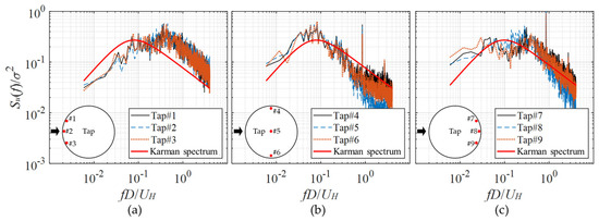 Figure 11a shows the pressure spectra in the windward area, which has relatively higher energy in the high-frequency range compared with the Karman spectrum, with peaks appearing around the normalized frequency of 0.3–0.4. This was attributed to the influence of the vortices caused by the separation, as explained in the pressure coefficient section. Figure 11b shows the pressure spectra in the dome center area, with a peak appearing around the normalized frequency of 0.08, similar to the Karman spectrum, and rapidly decreasing energy in the high-frequency range. Figure 11c shows the pressure spectra in the leeward area, with increased energy in the high-frequency range compared with that shown in Figure 11b, and an additional peak appearing around the normalized frequency of 0.2. This peak was attributed to the turbulence generated by the wake [10,19]. As shown in Figure 11, the shapes and amplitudes of the pressure spectra were similar at different tap locations in the spanwise direction.