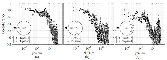 Figure 12 shows the co-coherence of the fluctuating wind pressures of the pressure taps located in the spanwise direction, corresponding to the pressure taps as illustrated in the pressure spectra in Figure 11. Co-coherence is defined as the real part of the cross-spectral density using the following equation: