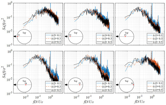 Figure 13 shows the pressure spectra of the pressure taps located on the streamwise centerline. The pressure spectra for all h/D values are displayed to examine the effects of the variations in h/D on the spectra. The pressure spectra for h/D = 0.1 have relatively higher energy in the high-frequency range at pressure taps other than those at the windward and leeward roof edges. This is believed to be related to the turbulence generated from the ground surface due to the low h/D. However, the peak frequencies and spectral shapes were not significantly affected. Examining the changes in the pressure spectra according to the location of the pressure taps, the increased energy in the high-frequency range and the peaks in the windward area compared with the Karman spectra decreased as they approached the dome center, causing a decrease in the peak frequency. As the taps moved toward the leeward area, the energy in the high-frequency range increased again, and an additional peak appeared around the normalized frequency of 0.2. The clear peaks in the narrowband near the normalized frequencies 1 and 3, as shown in Figure 13, were not reflected in the analysis because they were caused by mechanical effects rather than aerodynamic characteristics.