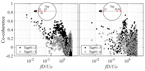 Figure 14 shows the co-coherence of the pressure taps located in the spanwise direction. The graph is plotted based on Tap# 1. Moving toward the leeward side, the peak at a normalized frequency of 0.4, which appeared on the windward side, gradually decreased, and the correlation in the leeward zone was confirmed to be very low. As previously explained, the peaks at the normalized frequencies of 1 and 3 in Figure 13 are not caused by aerodynamic characteristics but by mechanical influences.