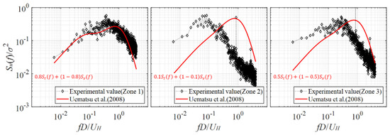 Figure 16 shows a comparison of the pressure spectra. The spectral model proposed by Uematsu et al. [12], which was used for comparison, is marked with a solid red line, and the weight coefficients used in the calculation are shown in the graph. Overall, it can be observed that the two spectra do not match in all the zones. This is because of the differences in the fluctuating wind–pressure characteristics according to the roof shape. As the rise of the dome roof decreased, the space where vortices were generated owing to separation increased, and the reattachment distance also increased, causing a greater impact of separation on flat roofs. Thus, the pressure spectra proposed by Uematsu et al. [12] exhibited a peak in the high-frequency range owing to the influence of the vortices caused by separation, thereby indicating limitations in their application to the target of this study: a dome roof with f/D = 0.1.